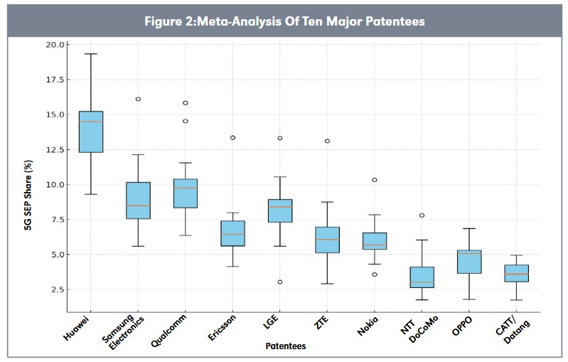 In Figure 1, we can see that landscapes differ in their conclusions about a single exemplary patentee: ZTE. Its 5G patent percent share is between 2.9 percent and 13.1 percent, a 4.5x range or a standard deviation of 0.023. The collective cellular patent landscape studies show a standard deviation of as little as 0.009 and as much as 0.028 across 10 major patentees, with 4 of the 10 studied patentees having a standard deviation equal to or larger than the patentee depicted here. These differences in cellular patent landscape conclusions could have a colossal impact. Imagine an individual working with this patentee, engaging with an individual working with a counterparty over the patentee’s portfolio. While these parties might ultimately resolve their differences, they would need to overcome quite a bit of adversity to do so.