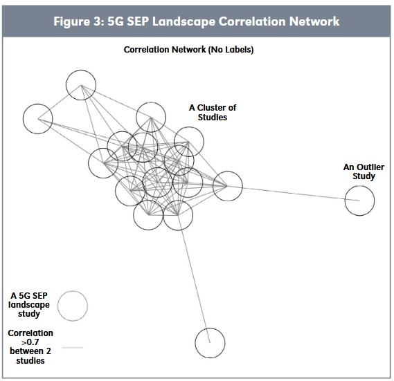 Figure 3 depicts a correlation network, with links representing a correlation of > 0.7 between a pair of 5G patent landscapes. We can see that four landscapes appear relatively loosely correlated and lie on the outskirts of the plot. Three of these landscapes have an average correlation with other studies of < 0.52. Twelve landscapes appear relatively clustered toward the center, among which are four studies with an average correlation of > 0.81.
