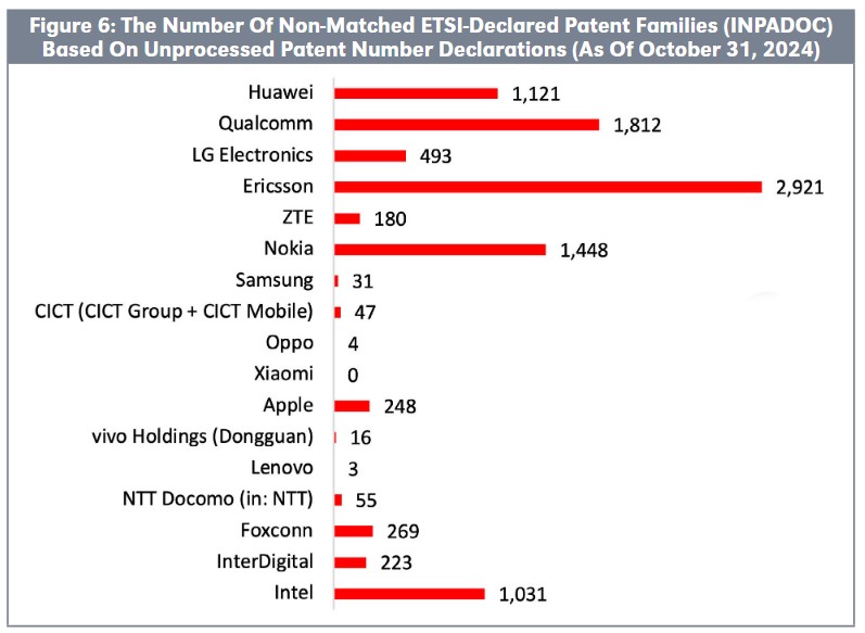 Companies submit patent numbers in various formats and types, leading to inconsistencies in matching ETSI-declared patent families. Figure 6 highlights the number of non-matched ETSI-declared patent families (INPADOC) by declaring company when relying solely on unprocessed patent number declarations.