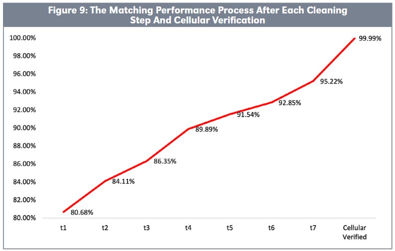 Figure 9 illustrates the progress of matching and cleaning efforts, showing how the average matching rate improved from t1 (initial matching efforts) to t7 (final application of matching processes). One significant cleaning step included a thorough investigation of identifying and matching provisional and priority patent application numbers between t6 and t7. While rigorous cleaning substantially enhances data accuracy, achieving a perfect match rate is nearly unattainable without direct input from declaring companies responsible for the declared patents. Figure 9 illustrates that the Cellular Verified Initiative successfully increased the matching accuracy to ultimately achieve 99.99 percent accuracy of all published patent documents.¹⁰